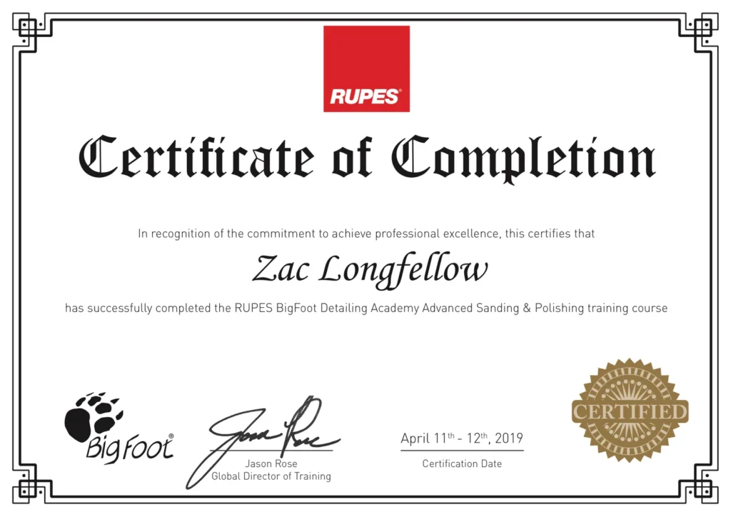 Zac has been professionally trained and certified by some of the most prestigious organizations, including Rupes, Ceramic Pro and a proud member of the International Detailing Association.